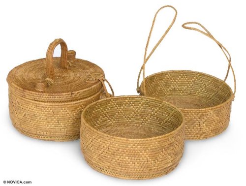 NOVICA, in association with National Geographic, offers thousands of limited edition and one-of-a-kind gifts, jewelry, and home decor treasures handmade by master artists and artisans throughout the world. Nengah Danantara highlights ate's natural elegance in a versatile set of three baskets. Danantara's design is similar to Bali's rantang, which piles up to six food containers. Woven by hand, this set of stackable baskets features one lid and long ate straps. Artisan Info: "I was born on November 16, 1978, the second child in family. My mother is Nengah Suji, a senior ate maker in our village. My father was a cab driver; I often accompanied him driving around when I was a child. Time passed by, and I learned to print Balinese handwriting on a palm leaf, as well as carving images on this leaf; my grandfather taught me. When demand grew for ate products, many in my village started dedicating more time to this craft, and I saw it as a challenge to learn how to make these items too. "Weaving ate is not as hard as people may think, but it's not an easy work either. One needs a lot of patience to weave one tiny piece of ate into a basket or bag. "I would like to thank Novica for making my work part of the largest network of artists in the Internet. I hope my products find favor with Novica clients."