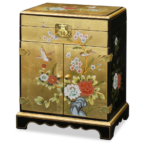 Asian influences transform a room with quiet beauty and golden serenity. This jewelry chest features hand-painted traditional Chinese flower and bird on the gold leaf background with mirrored lift-top and felt-lined ring trays. Double doors reveal four felt-lined drawers. Brass hardware. A perfect gift for her.